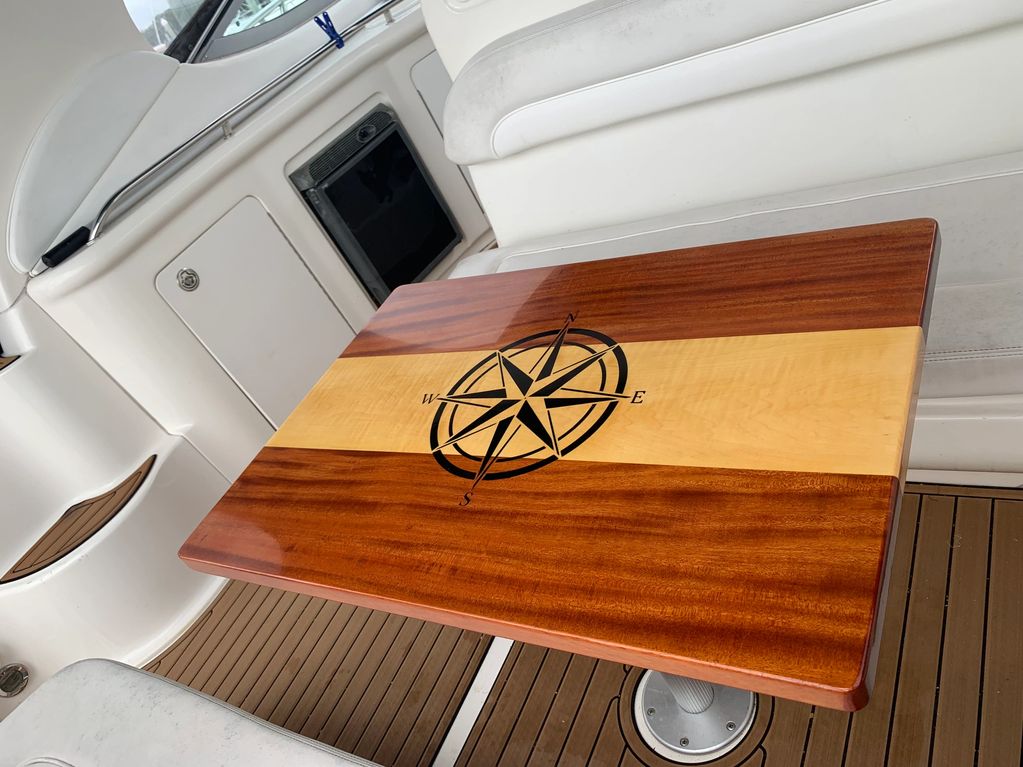 Custom designed, this African Mahogany and Sugar Maple cockpit table for a power boat features a compass rose inlay. The striking ribbon figure of the mahogany blends with the quiet figure of the maple to provide a pleasant complementary look.